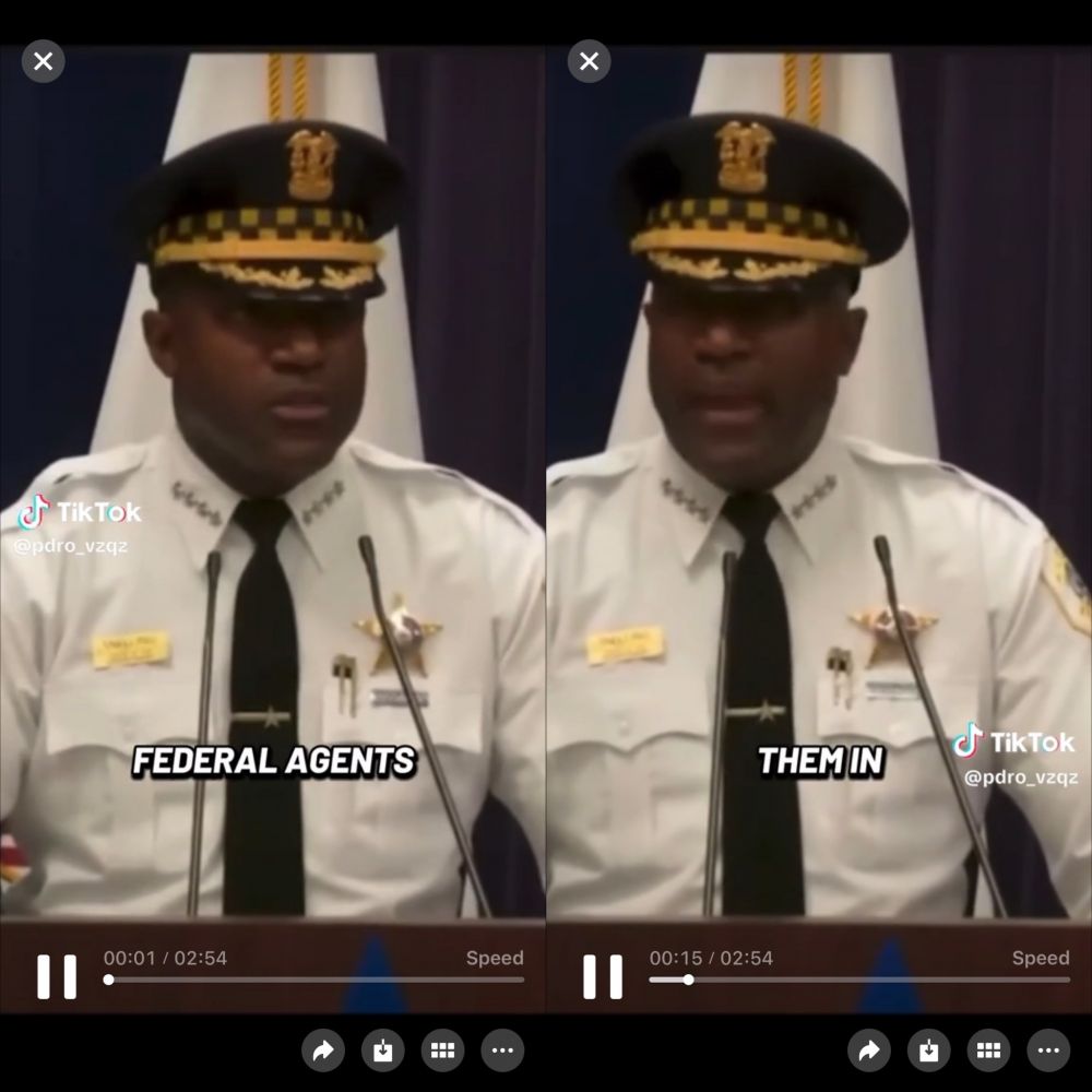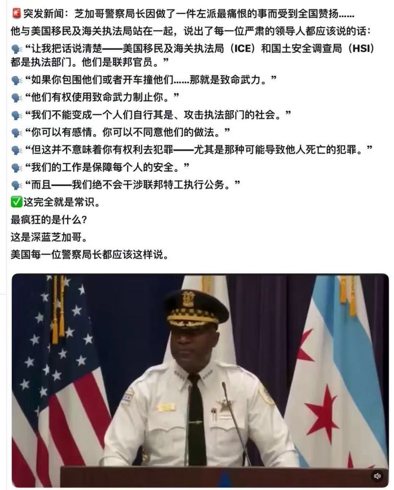 众所周知的芝加哥绝对是主党的大本营,那么这位警察局长绝对不可能与MAGA有任何牵连,所以可以算正常执法人员的正常反应吧? 当然,这位哥们能当上局长肯定因为肤色正确。但肯定也是从基层干出来的,所以才深深担忧法制的崩溃,完全让手下人无法执法。而且正因为肤色正确,更让那些强词夺理的无话可说。 明明白白的车撞上了执法者,其实更可怕的还是面带微笑进行的这一切,各位可以自行脑补一下得出自己的结论,我不愿作诛心...