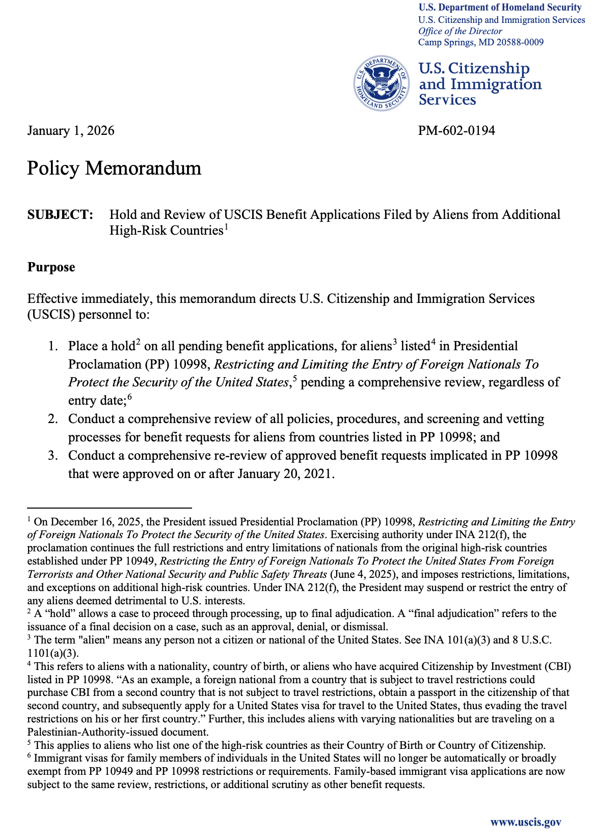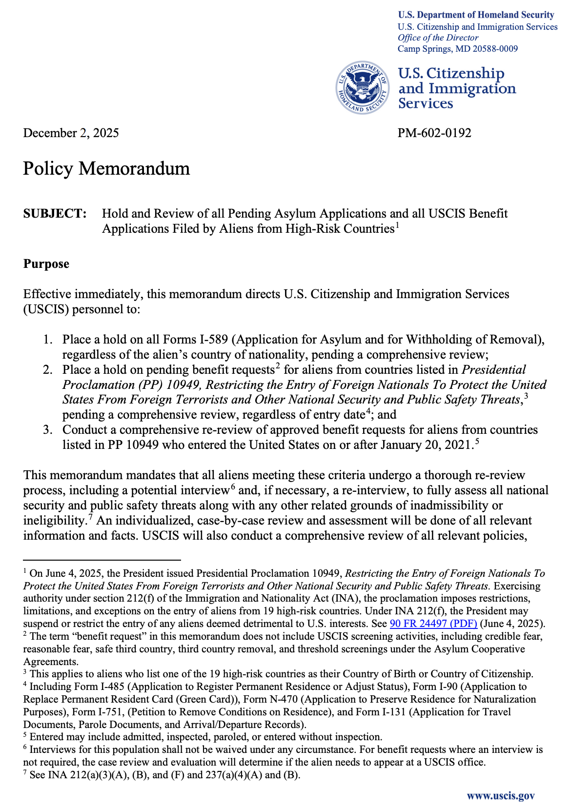 争议的核心,源于USCIS在2025年12月2日与2026年1月1日发布的两份内部政策备忘录,编号PM-602-0192与PM-602-0194。文件以“国家安全”为由,要求暂停审理来自39个所谓“高风险国家”的几乎所有移民申请,其中包括I-485身份调整这一绿卡关键步骤。