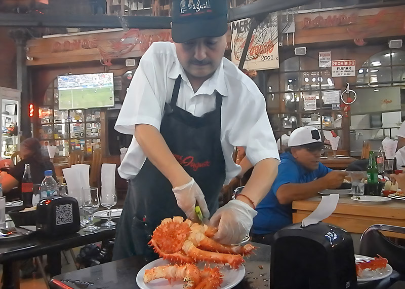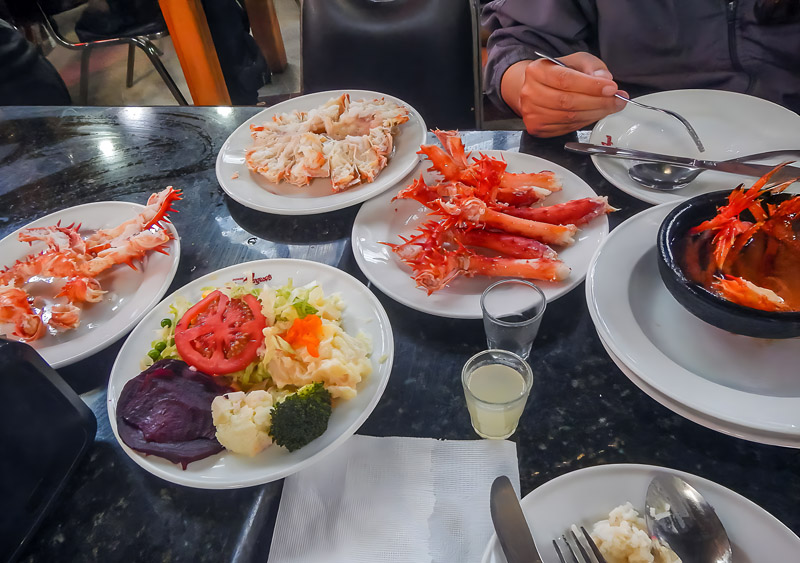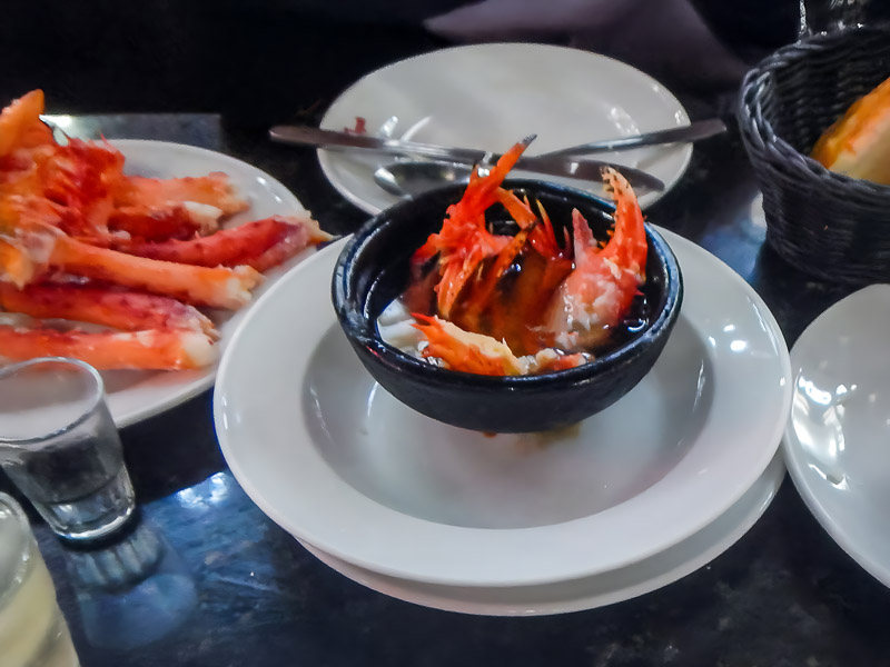 南美通胀厉害,菜单上所有的价格都被划掉重新定价了,以前中号帝王蟹要价7万比索,现在要9万比索(大约112美刀)。吃整只帝王蟹的套餐是餐馆送饼、色拉、米饭和土豆泥,还送了两小杯果酒。