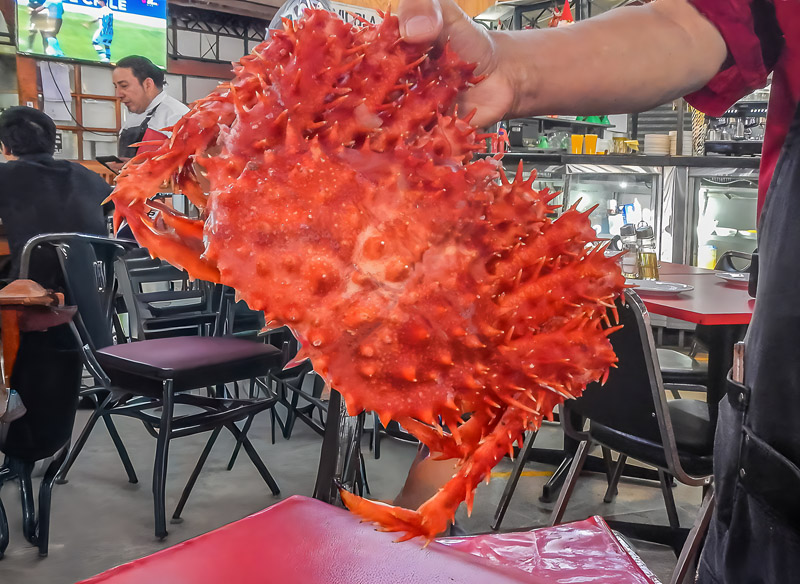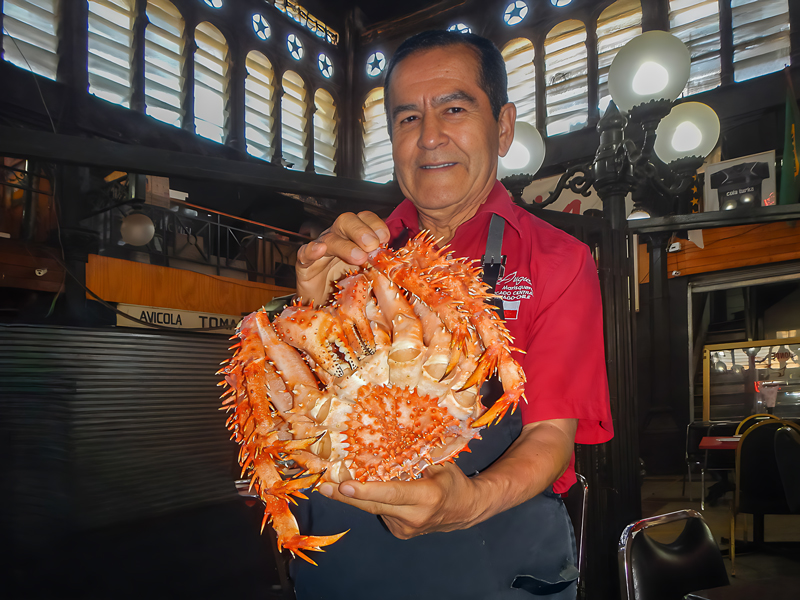智利有漫长的海岸线,盛产海鲜。听说帝王蟹是一绝,我们南美游轮行时就计划去吃一顿。游轮停靠瓦帕莱索港(Puerto Valparaiso),没弄清情况,进了港口一家海鲜店,菜单上没有整只蟹。后来到了智利首都圣地亚哥,查明了吃蟹最好的餐厅叫奥古斯托餐馆(Donde Augusto ),在中央市场(Centolla)。