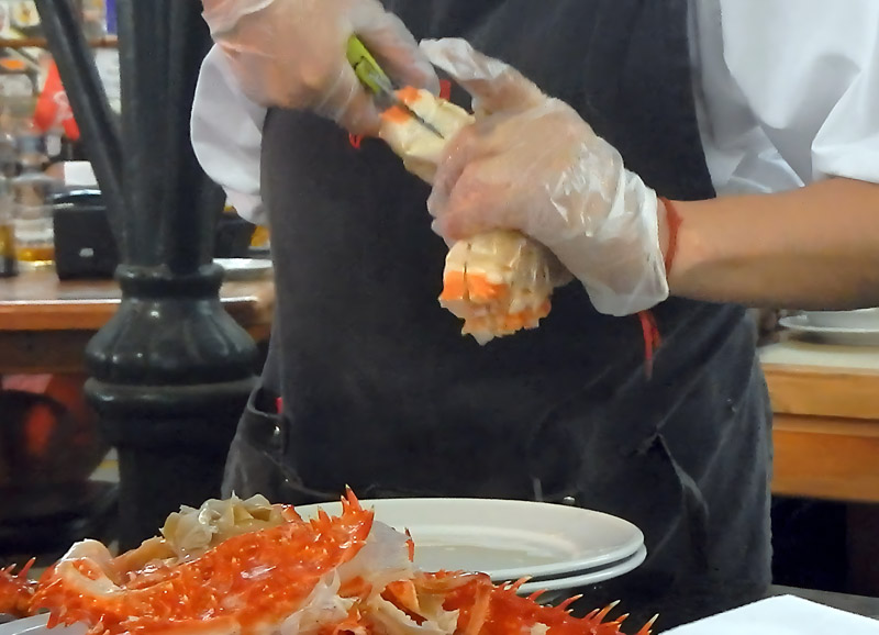 这家餐厅的整只蟹有“大号、中号、小号”三种个头,价格递减。一个老年面善的待者招呼我们就座,他不会英语,领导结结巴巴用西语先问他是不是鲜活宰杀,他摇头。又问中号螃蟹有多大个儿,他比划了半天也说不清楚,干脆跑到后厨去拿出一只中号蟹来给我们看。在我看来螃蟹个头大的惊人,我们两人吃足够了。螃蟹红红的,颜色十分喜庆,张牙舞爪的样子,长腿上长满了刺,乍一看形状像蜘蛛,怪不得有人说到智利吃的是“蜘蛛蟹”。老年招待说是只公蟹,好像母蟹是不准捕捞的。