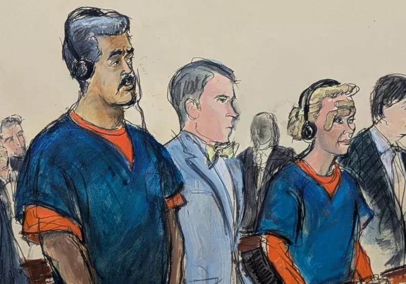 美东时间1月5日,马杜洛首度以被告身分现身于纽约曼哈顿联邦法院。图片由法庭速写师Elizabeth Williams绘制。AP
