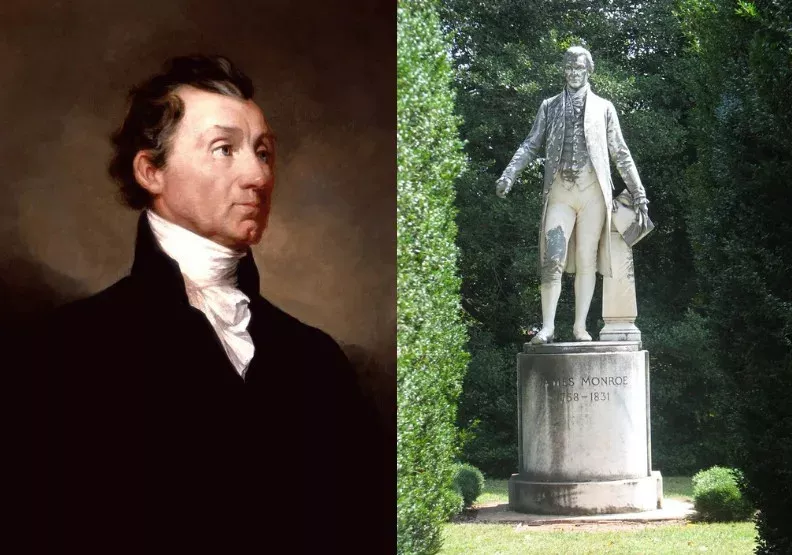 美国第五任总统门罗。图右为位于维吉尼亚州夏绿蒂镇的门罗雕像,门罗曾于此居住。wikimedia commons