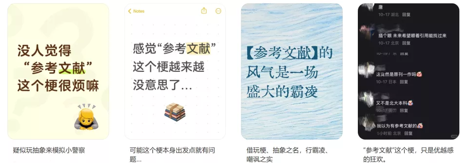 (参考文献梗,指以引用参考文献的形式对与大众认知相悖的言论进行抽象二创,在戏谑的外衣中包藏伤害和冷漠的本质)