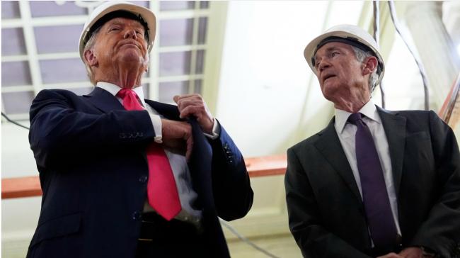 2025年7月,美国总统川普和美联储主席鲍威尔在美联储的施工现场参观时头戴安全帽。图片来源:Julia Demaree Nikhinson/AP
