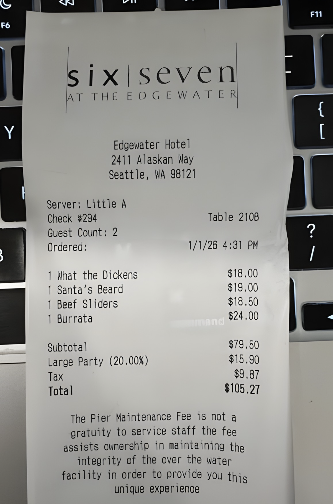 据报道,2026年1月跨年夜的美好夜晚,一对夫妇走进位于Edgewater Hotel内的Six Seven Restaurant,原本只想安静地喝两杯酒、吃点小食,享受普吉特湾夜景带来的片刻浪漫。这家餐厅以“水上用餐体验”和城市天际线景观闻名,是不少本地人和游客心中的“氛围感餐厅”。然而,这场本该轻松愉快的约会,却在结账时急转直下。