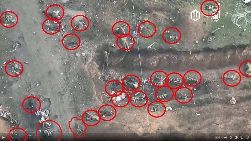 一张满地都是阵亡的俄军士兵的影像。 图:翻摄自X帐号@GrandpaRoy2