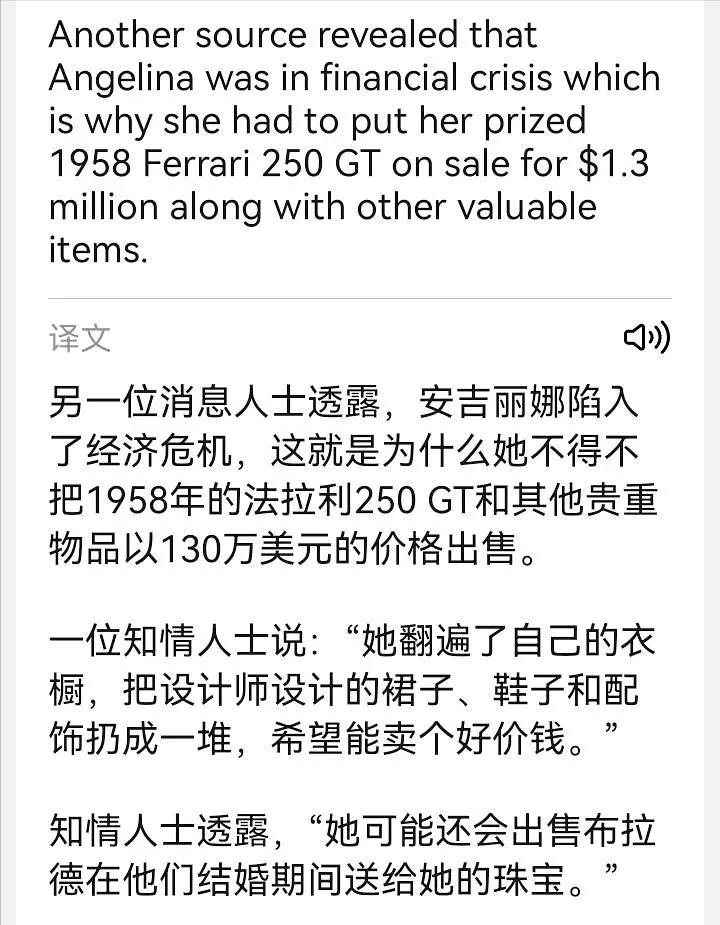 最新的爆料中,朱莉此次出售的不仅限于衣物、珠宝首饰,还将一辆1958年的法拉利250GTO和其他贵重物品以130万美元的价格出售。
