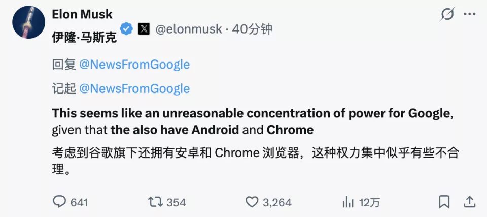 但马斯克第一个坐不住了,他直接在社交媒体上开炮:「考虑到 Google 已经拥有 Android 和 Chrome,这似乎是一种不合理的权力集中」。
