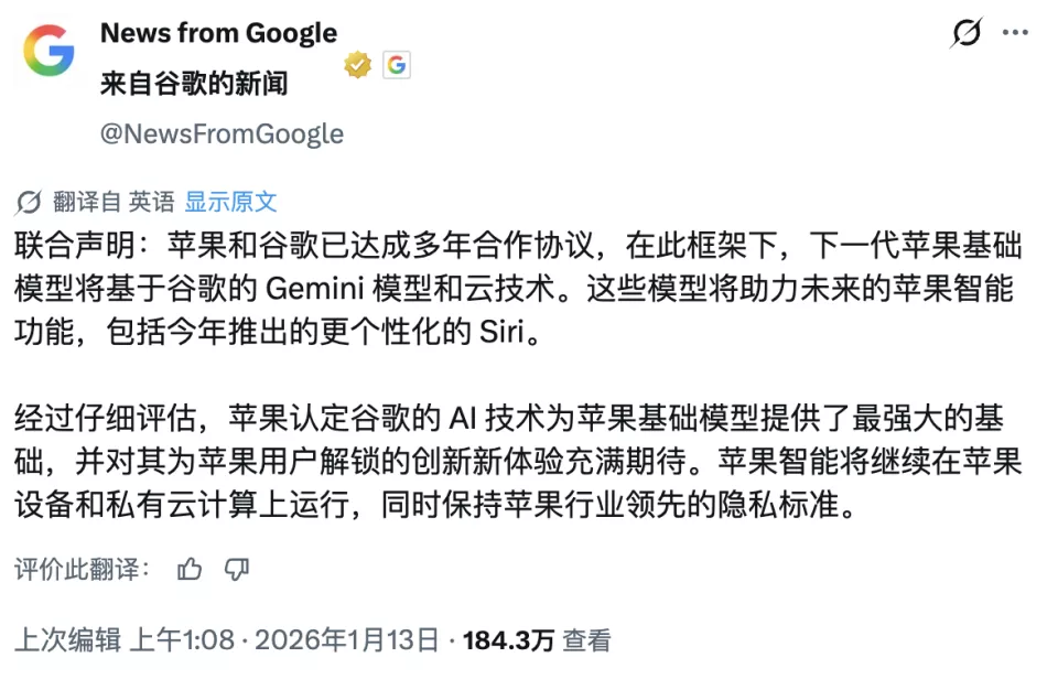 就在刚刚,苹果和 Google 发布联合声明,双方达成多年深度合作协议。下一代「苹果基础模型」将直接基于 Google 的 Gemini 模型和云技术构建。
