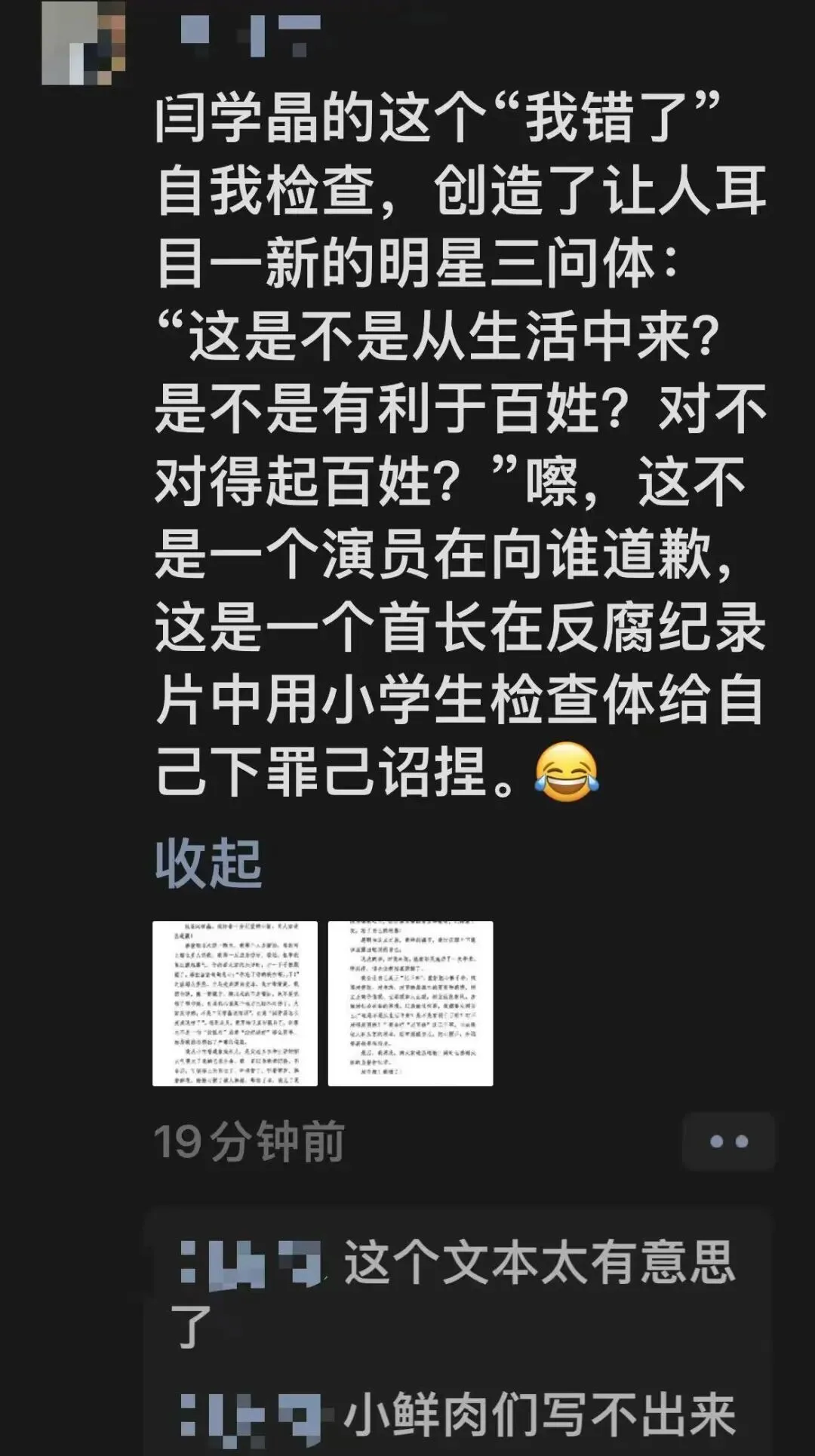 闫学晶的道歉信,代表了一种“检查体”的文艺复兴。