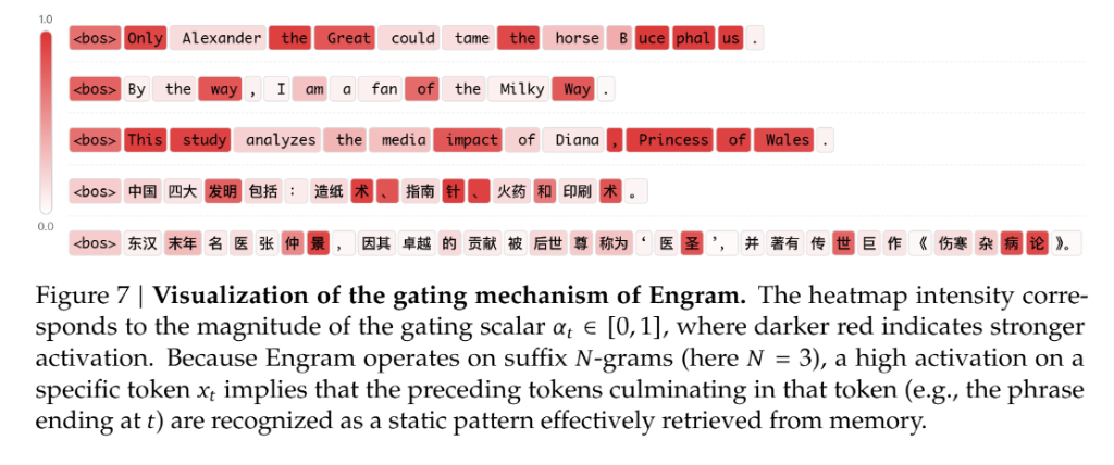Engram模块:它是一个巨大的、可扩展的嵌入表(Embedding Table)。当模型读到“张仲景”或者“四大发明”这种固定搭配(N-gram)时,不需要动用大脑皮层去推理,直接通过哈希索引,在内存表中“查”出对应的向量。
