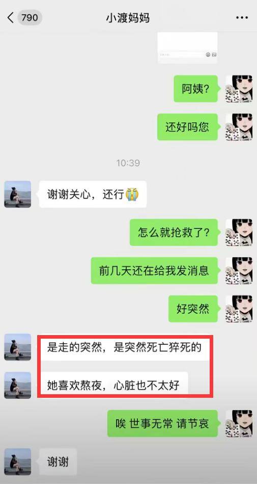 从好友分享的聊天记录可以得知,口子姐去世之后,她的朋友曾发信息慰问其妈妈,口子姐妈妈表示女儿走的十分突然,因为她心脏一直不太好外加喜欢熬夜。