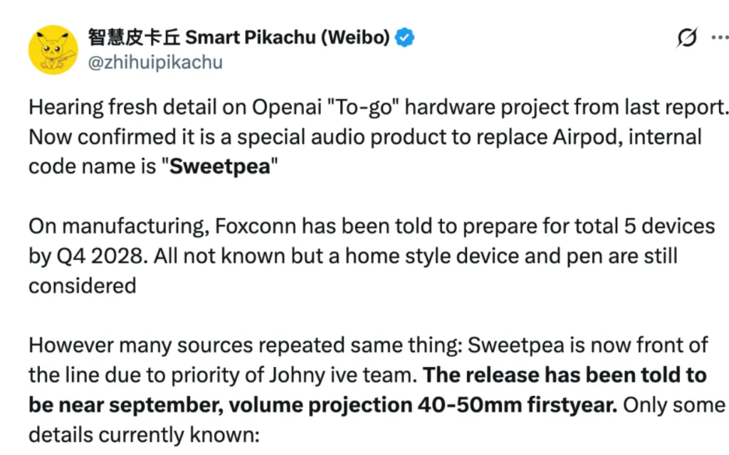 该硬件已被确认是一款取代 AirPods 的特殊音频产品,内部代号为「Sweetpea」(香豌豆)。