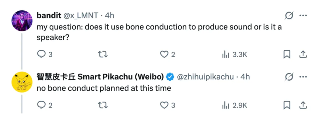 在评论区,这位博主回答了更多关于这款设备的信息,比如「它的发声是通过骨传导,还是内置了扬声器?」,答案是「目前没有采用骨传导的计划。」