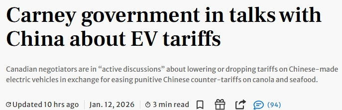 据报道,加拿大谈判代表目前正与中国进行“积极磋商”,讨论是否下调或取消对中国制造电动车的关税,以换取中方放松或取消对加拿大油菜籽和海产品的惩罚性反制关税。