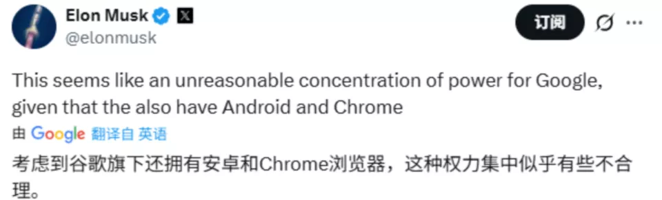 反应最快的是特斯拉和xAI的CEO埃隆·马斯克,他在苹果和谷歌官宣后几小时内就在X平台上开火:“考虑到谷歌已经拥有Android和Chrome,这似乎是谷歌权力的一种不合理集中。”