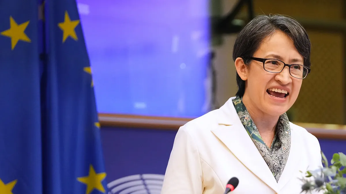 2025年11月7日,副总统萧美琴在欧洲议会发表演说。演讲。 IPAC。(美联社)
