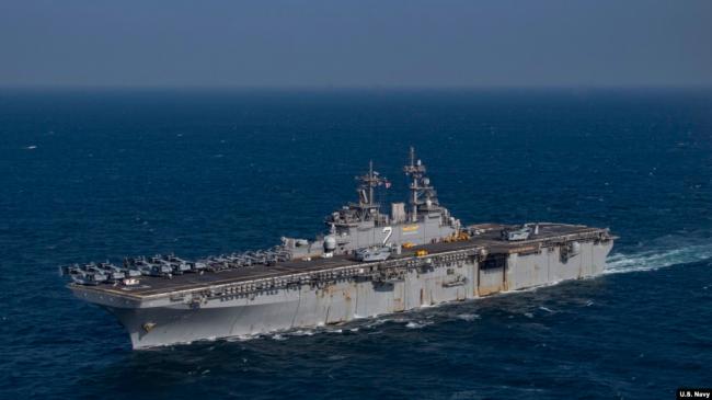 资料照片:美国海军两栖攻击舰“埃塞克斯”号驶过阿拉伯湾。(2021年11月13日)