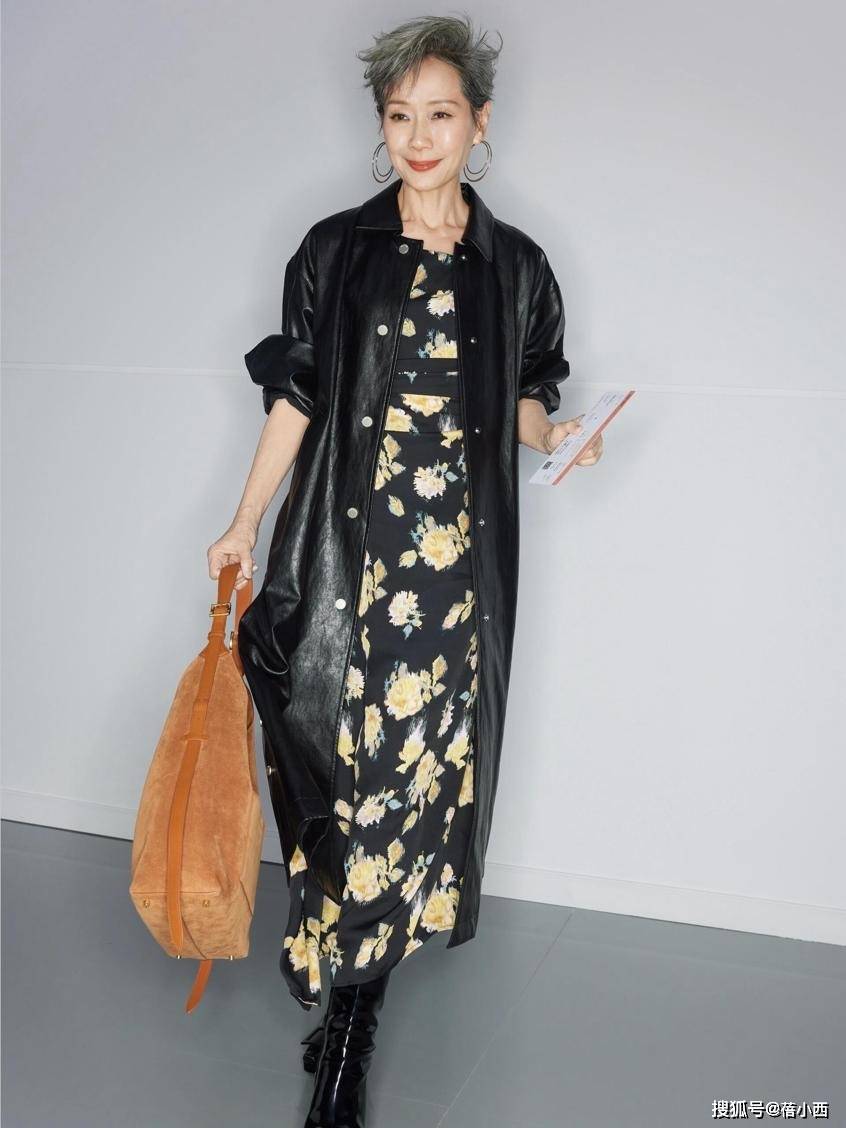 黑色皮衣配连衣裙很有新意,皮质面料难免给人严肃感,而休闲风连衣裙常与优雅、知性联系在一起。叶童身上是印花裙,从颜色上看不挑穿着者年纪,主要关注点是裙长。
