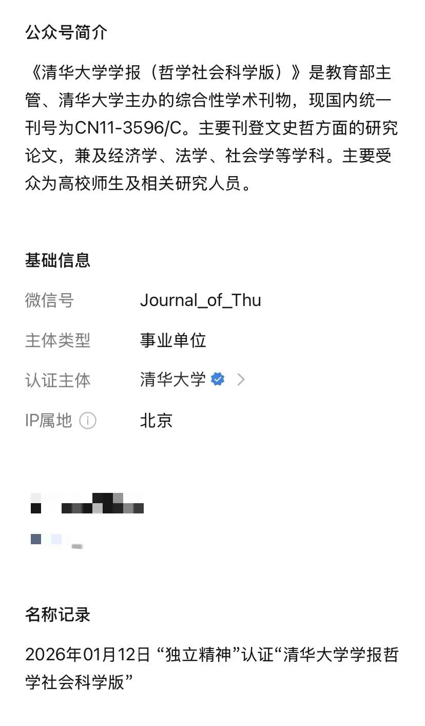 当然,需要再次强调的是,改名的并不是清华大学的学术刊物本身,而是一个认证主体为清华大学的微信公众号。