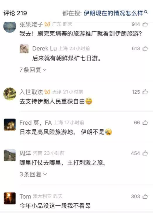 网友对此议论纷纷,有人表示“我去!刷完柬埔寨旅游推广就看到伊朗旅游?”“后来就有朝鲜(朝鲜)煤矿7日游。”还有人留言“日本是高风险旅游地,伊朗不是。”“哪里打仗去哪里,主打刺激之旅。”甚至有人嘲讽中国政府“话说这全面战略伙伴怎么还不帮兄弟一把,光送韭菜去有啥用?”