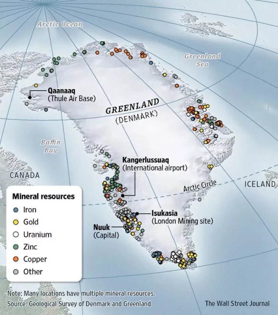格陵兰含有丰富稀土矿藏。图中蓝点为铁、黄点是黄金、白点为铀、绿点是锌、橘点是铜,灰点则属其他。(图/X平台 @Civixplorer)