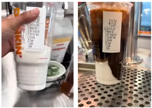 还有美国大火的连锁饮料甜品店唐恩都乐,一杯咖啡饮料能给你放50克糖,最高可选150克,小半个杯子都被糖占了,沉在底下化都不化不开。