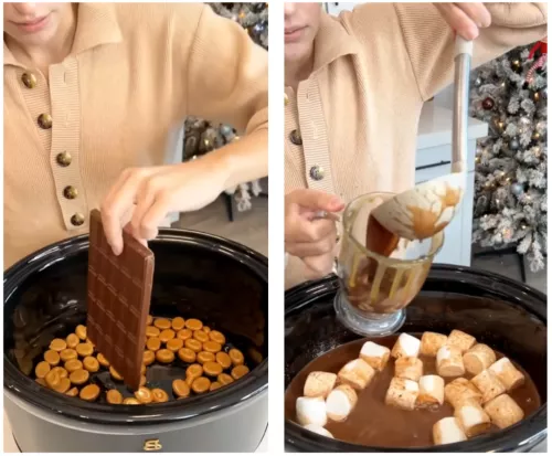 美国的热巧克力,跟中国也完全不是一个概念,他们会在锅里加入一整包硬糖和一大块巧克力,一起煮到融化,再倒入大量甜奶油和可可粉,以及大坨的棉花糖,舀出来装杯之前,还不忘在杯口挤上一圈焦糖酱作为点缀。
