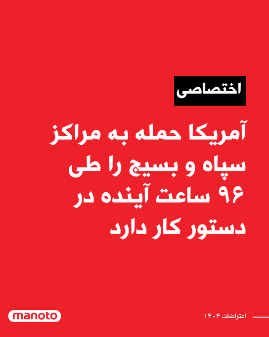 突发消息:美国计划在未来96小时内,对伊朗境内的军事和安全目标发动攻击。 Manoto电视台从一位消息灵通的中东人士处获悉,这次攻击的目标包括伊朗伊斯兰革命卫队和巴斯基民兵组织在伊朗各地的指挥总部。