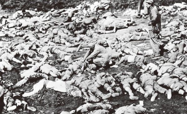 中共用志愿军肉身挡子弹。美军不断的射击,最后尸横遍野。(图片来源:视频截图)