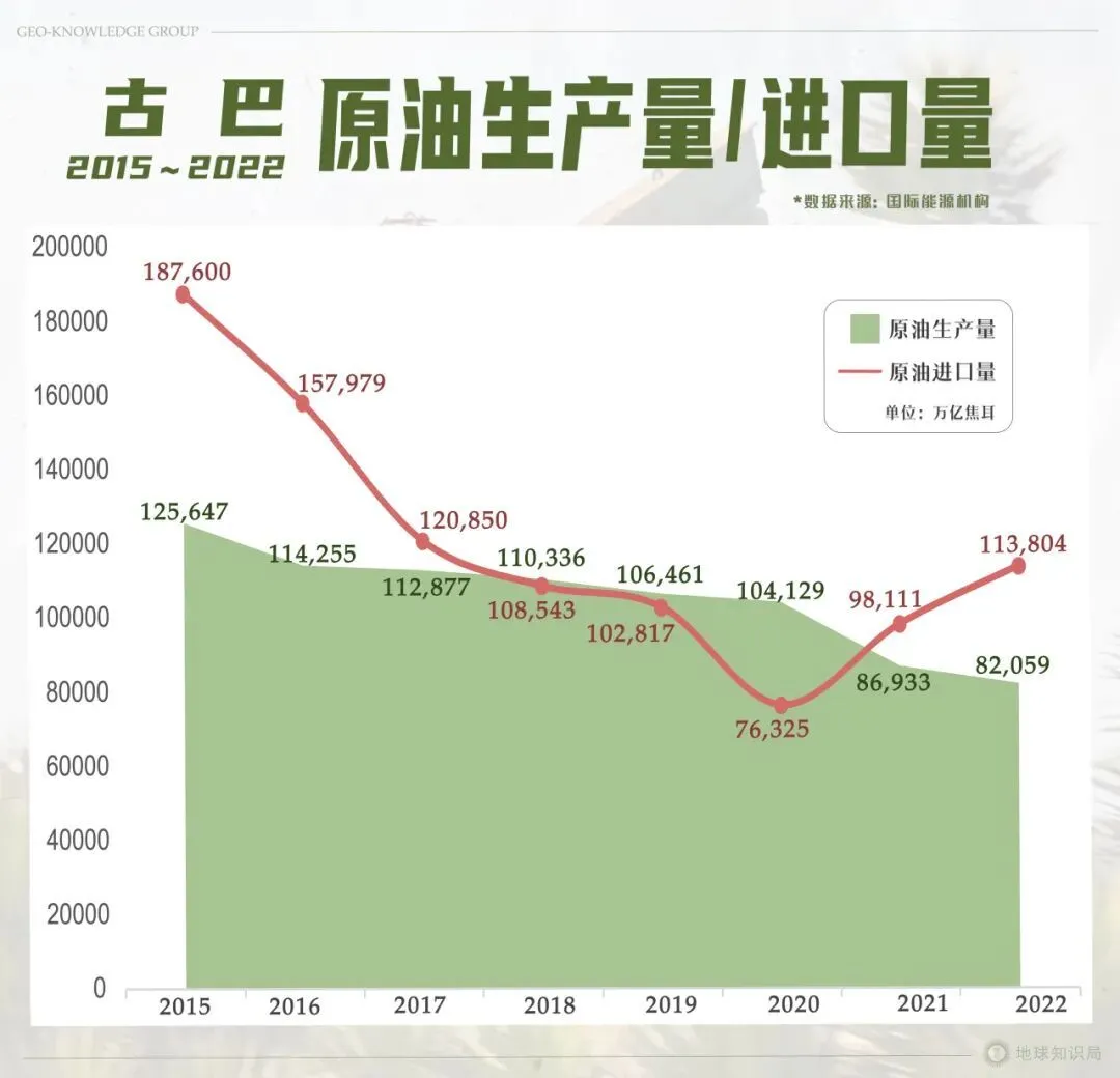 但这几年,委内瑞拉自己也很难过,对古巴的供油量一路下滑,只剩每天3万多桶,远远不够用。古巴不得不转向墨西哥,大规模进口石油,但是成本更高、稳定性更差。