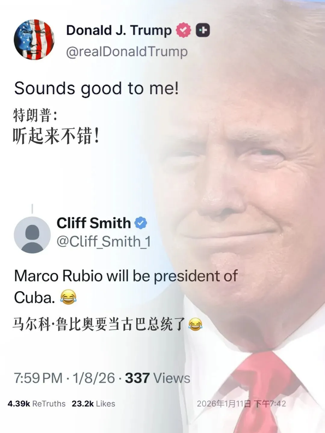 昨天,懂王转发了一条“鲁比奥将成为古巴总统”,顺手点评:“听起来不错。”
