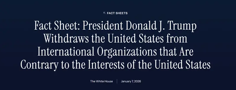 2025年2月4日,特朗普签署第 14199 号行政令,要求国务卿联合美国常驻联合国代表,对美国参与且提供资金支持的国际组织、以及美方缔约的各类公约条约进行全面审查,筛选出那些与国家利益相冲突的项目,并要求国务卿提交审查报告,随后这场筹备已久的行动最终在2026年1月7日正式落地。