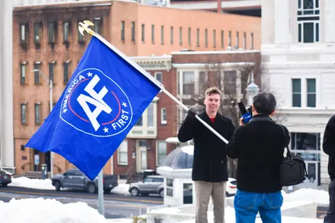 ▎特朗普支持者高举“让美国再次优先”的旗帜 图源:Shutterstock