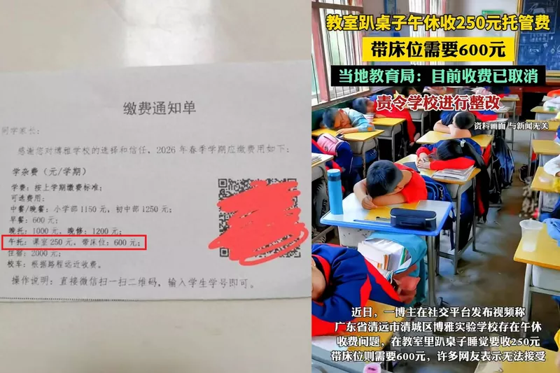 另据中媒指出,这并非中国首次发生学校向学生收午休费。2025年11月,位于河南洛阳瀍河区的君河湾小学,校方被家长踢爆一学期收人民币115元午休费;2023年8月,广东省东莞虎的门捷胜学校,则是一学期收每名学生人民币200元的教室午休趴睡费,如果在教室午休垫躺平则收人民币360元,至于在床位上午午睡得收人民币680元。