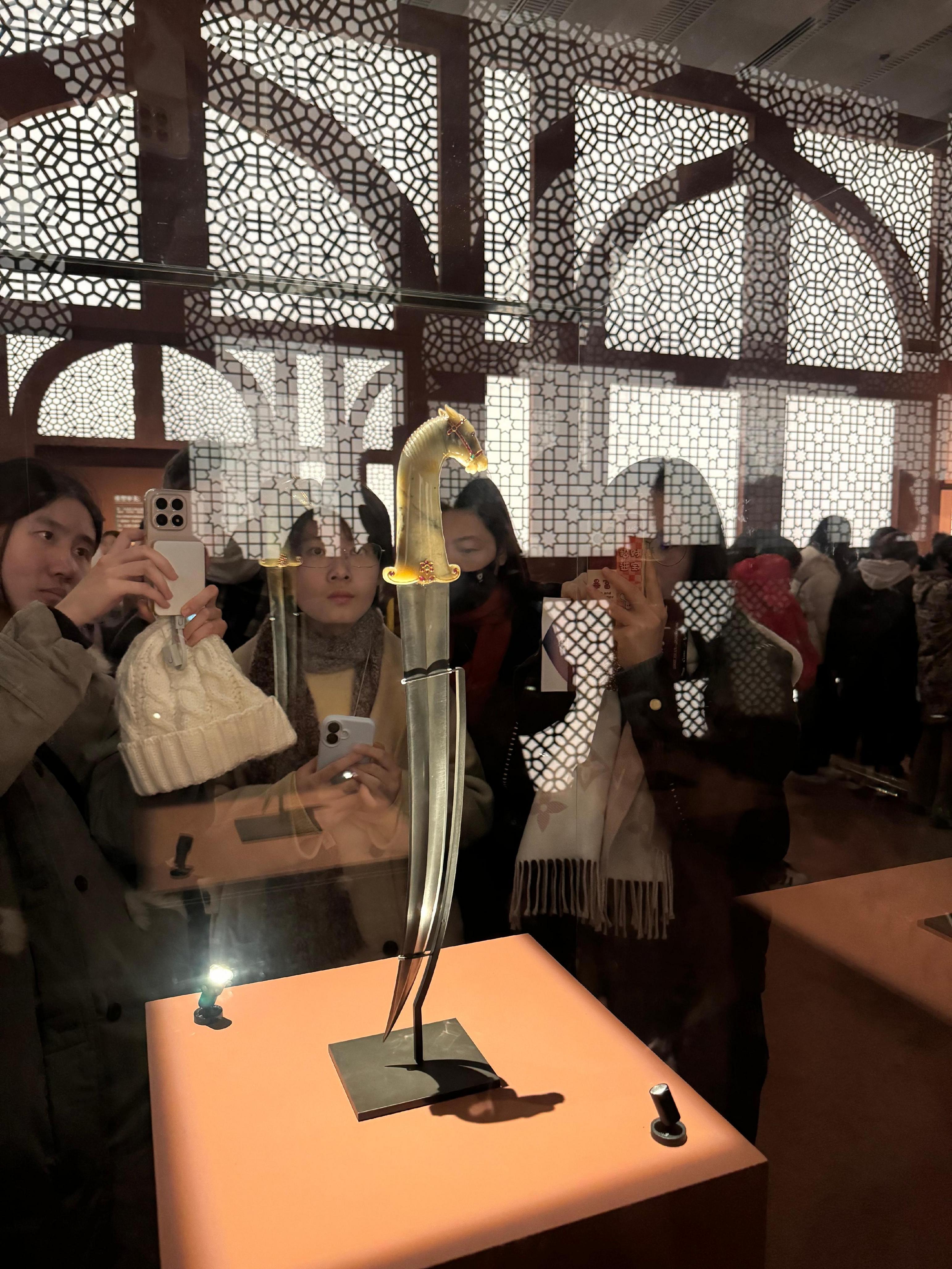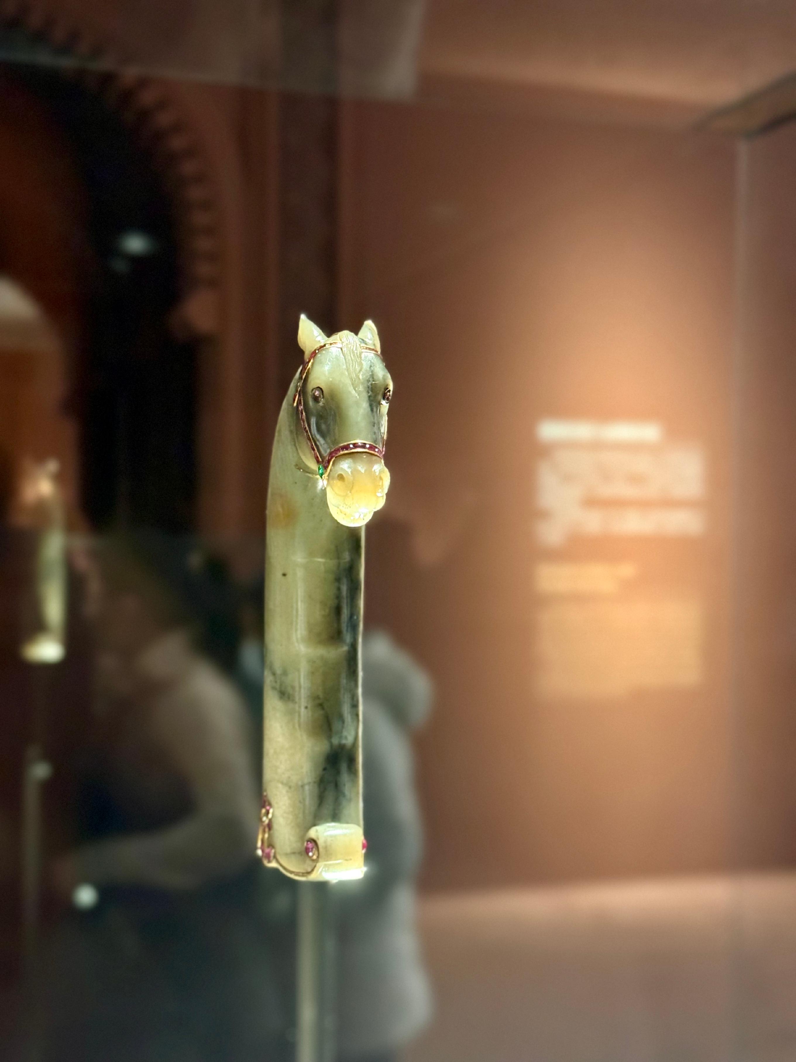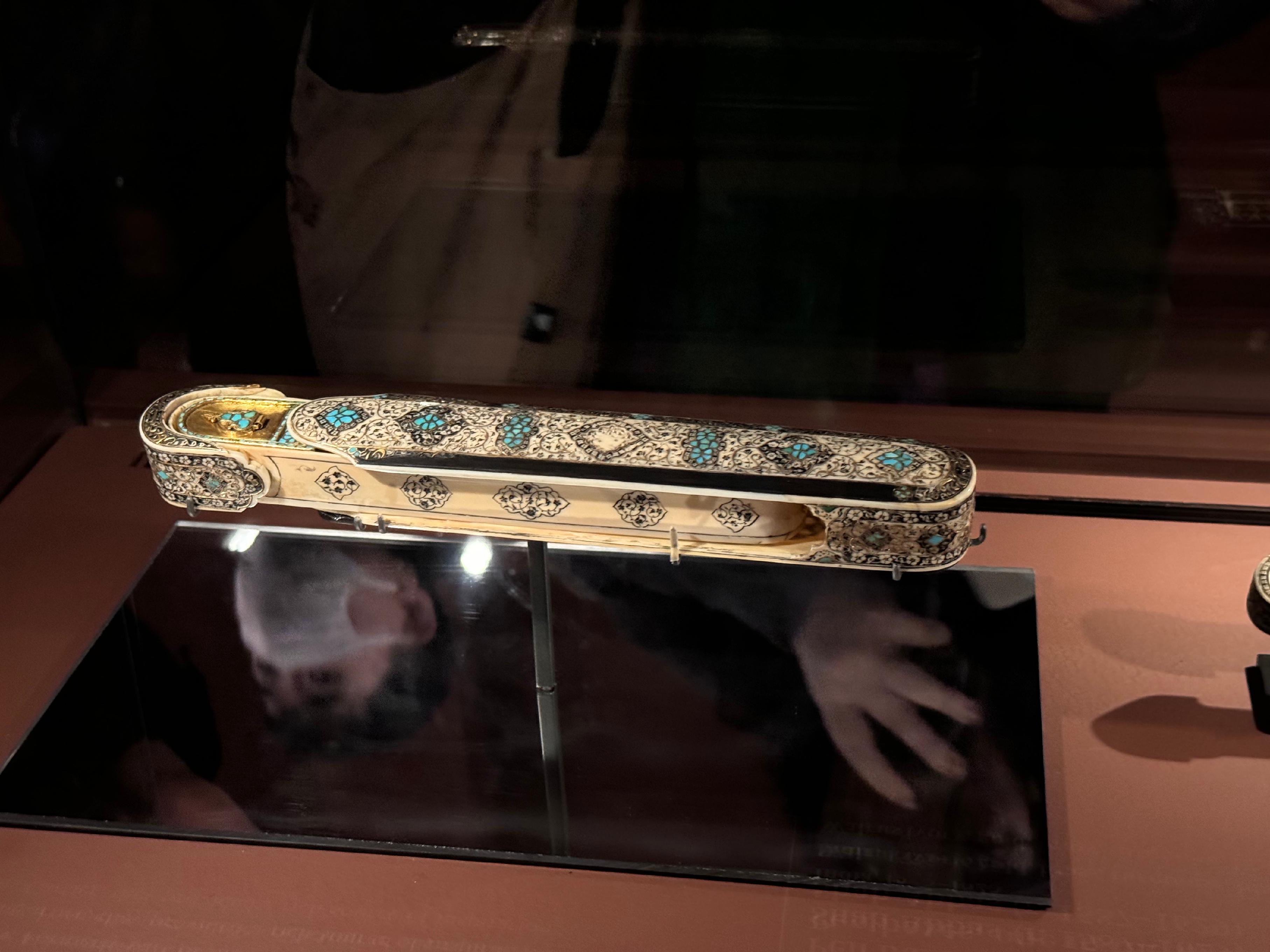 印度展厅以莫卧儿帝国为核心,展现其融合本土、波斯与欧洲传统的创新美学。莫卧儿王朝通过形式革新,创造出一种全新的艺术语言。皇帝们热衷搜集稀世奇宝——祖母绿、红宝石、玉石、大马士革钢,将艺术视为财富的延展。他们对玉石的精雕细琢令人叹服,甚至将匕首、梳子、鼻烟壶乃至鸡蛋大小的石头,雕刻成可佩戴、可传世的图案艺术品。展中顶流当属一件镶嵌红宝石、祖母绿与金线的马头匕首:玉石雕成的手柄暗示其奢华工艺,或为赏赐重臣、赠与结盟家族的礼物。这件武器与艺术的完美结合,正是莫卧儿帝国荣耀的缩影。另一组16世纪风靡印度与伊朗的装饰风格笔盒,曾为法国珠宝商路易·卡地亚带来灵感,亦成为展中亮点。