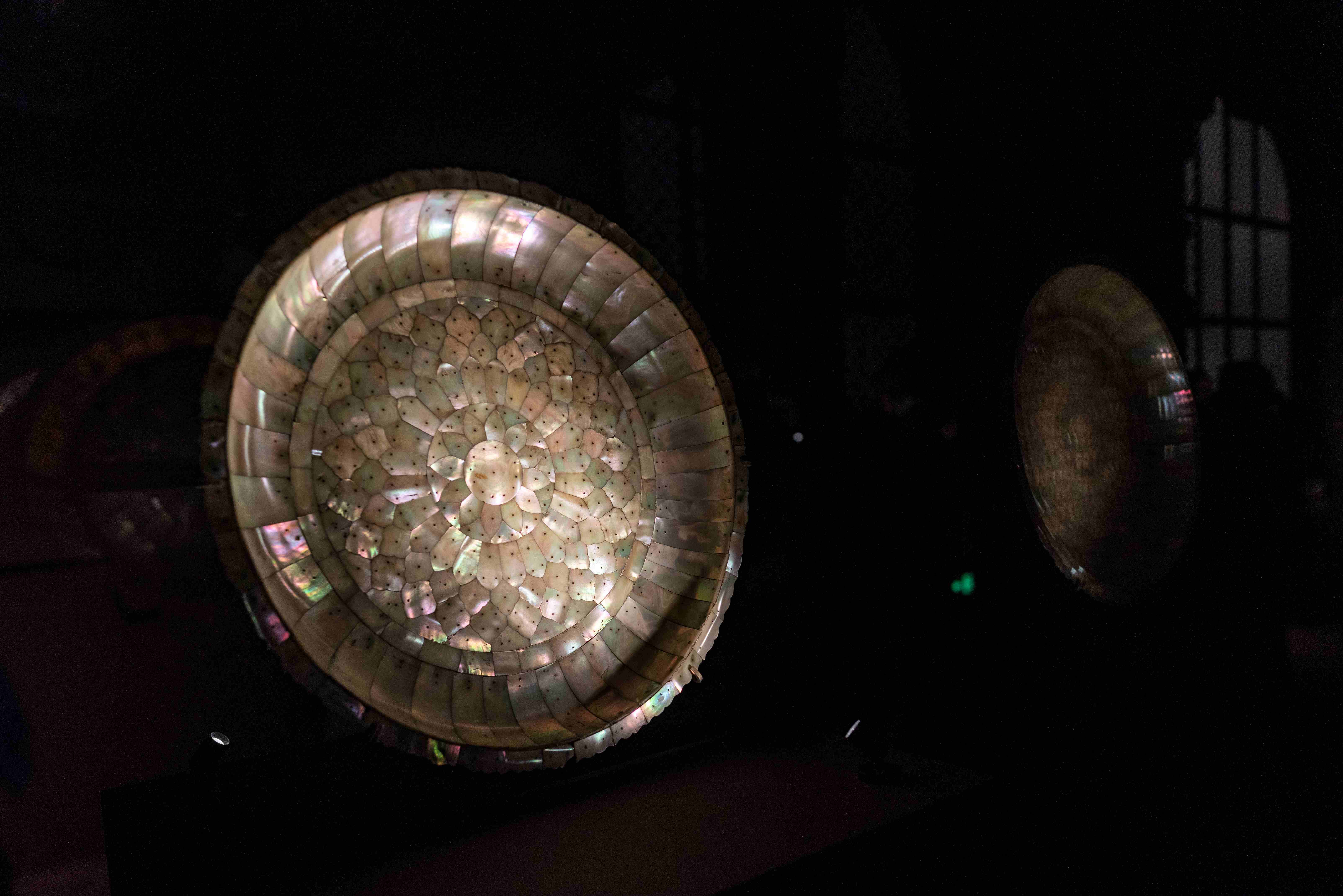 一件珍珠母贝材质的托盘堪称巧夺天工——它以花蕊为核心,放射状排列四种花卉,与珍珠母贝的光泽交织,构建出“花卉盛开的国度”。若未细观器物图案,或未将其与中西艺术中的类似纹样对比,便难以体会策展人的匠心。