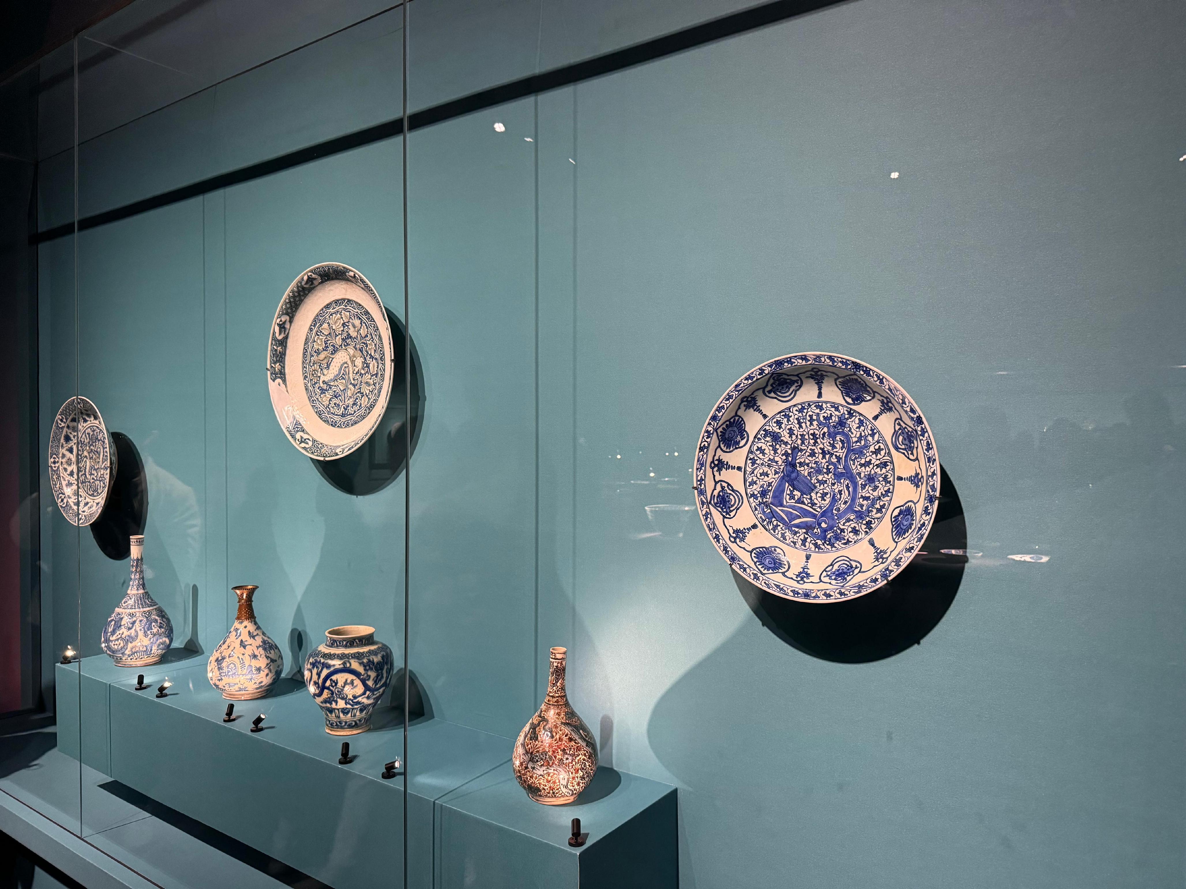 伊朗展厅则以“蒂芙尼蓝”为基调,营造出梦幻氛围。从中国到伊朗的贸易脉络中,17世纪欧洲与东亚商品对萨法维时期工艺品的影响尤为显著,尤其是陶瓷业。萨法维陶工竭力仿制中国青花瓷,作品虽与原型高度相似,却常以独特色调与工艺加以创新。尽管陶器在致密性与重量上不及瓷器,但成熟期的展品在图案设计、绘制工艺上堪称佳作,体现了细密画与波斯传统故事的深刻影响。