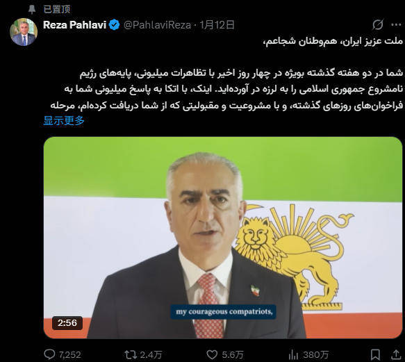 伊朗局势紧张后,巴列维一直试图将自己塑造为“过渡”领导人。过去两周里,他频繁在美国电视台、媒体和社交媒体露面,公开煽动伊朗骚乱,呼吁特朗普政府对伊朗进行军事干预。