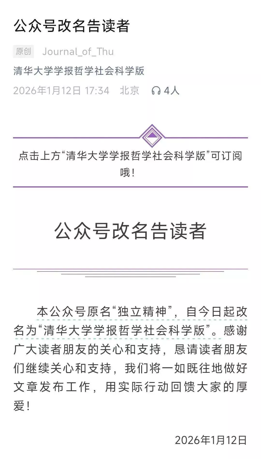1月12日,“独立精神”公众号改名“清华大学学报哲学社会科学版”,并表示将一如既往做好文章发布工作。