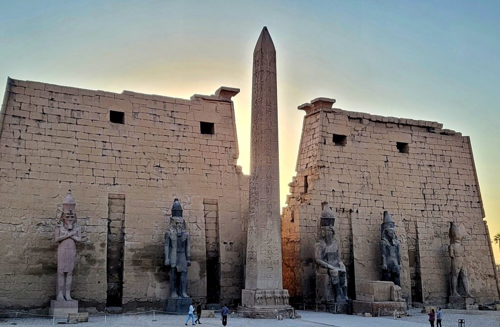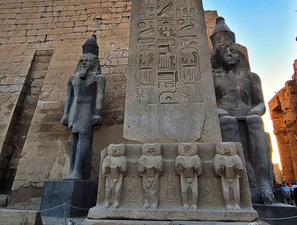 卢克索神庙入口处的方尖碑和拉美西斯二世的巨型雕像,这座方尖碑由粉红色花岗岩雕成,距今已有三千多年,出自拉美西斯二世统治时期(约公元前1250年)。当年卢克索神庙入口原有一对方尖碑,其中一座被移至巴黎协和广场。现存方尖碑的基座上刻有四只神圣狒狒,每一面也都铭刻着拉美西斯二世的王名。