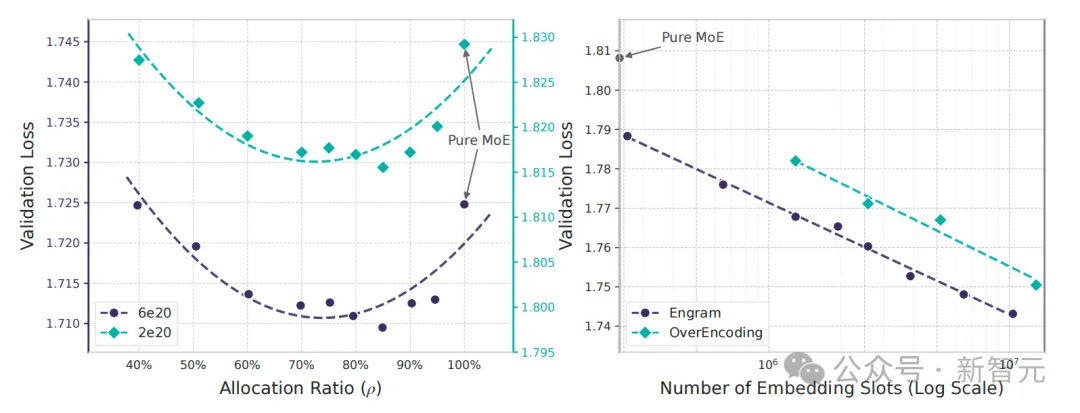 通过「稀疏分配」(Sparsity Allocation)建模,他们意外发现MoE与Engram之间,存在「U形scaling law」。