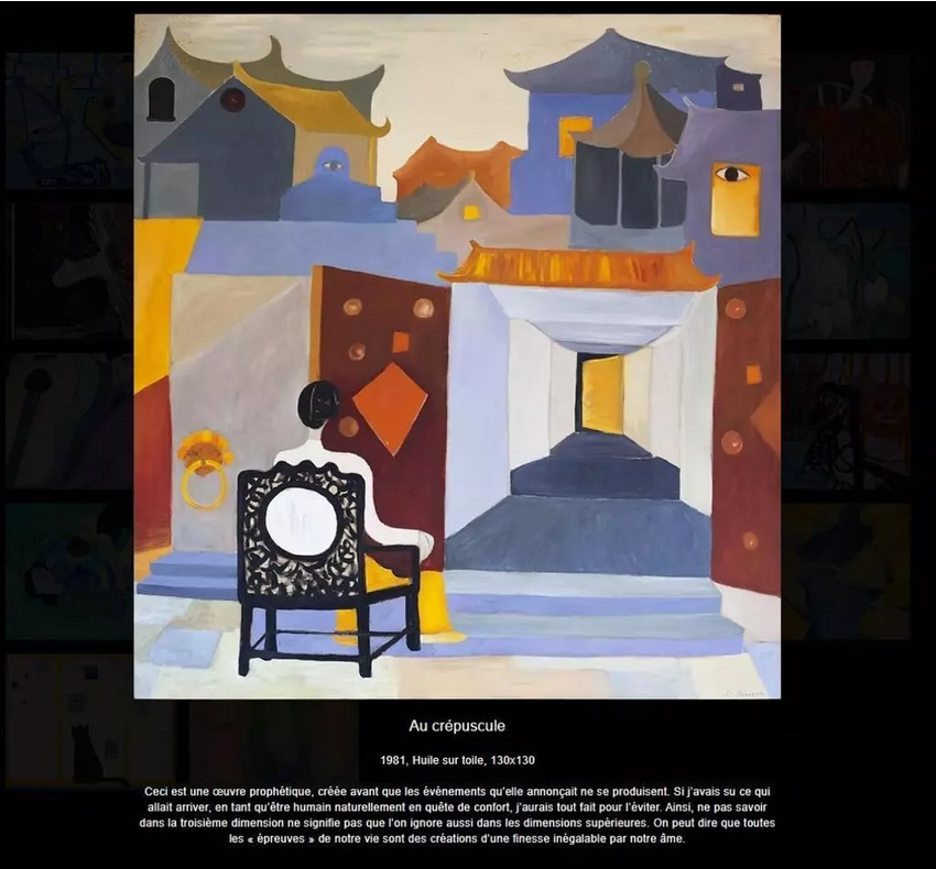 当时我一共画了三幅画,一幅叫《孤独》,一幅叫《欲望之影》,还有一幅叫《黄昏》。其中《黄昏》非常明显地表达了我即将面对的命运——一种被监禁、被审视、被评判的状态。画面中有一扇小小的黑门开着,一个女人坐在太师椅上,面对着一群模糊的人影。我画的时候,只是非常自然地把它画了出来。