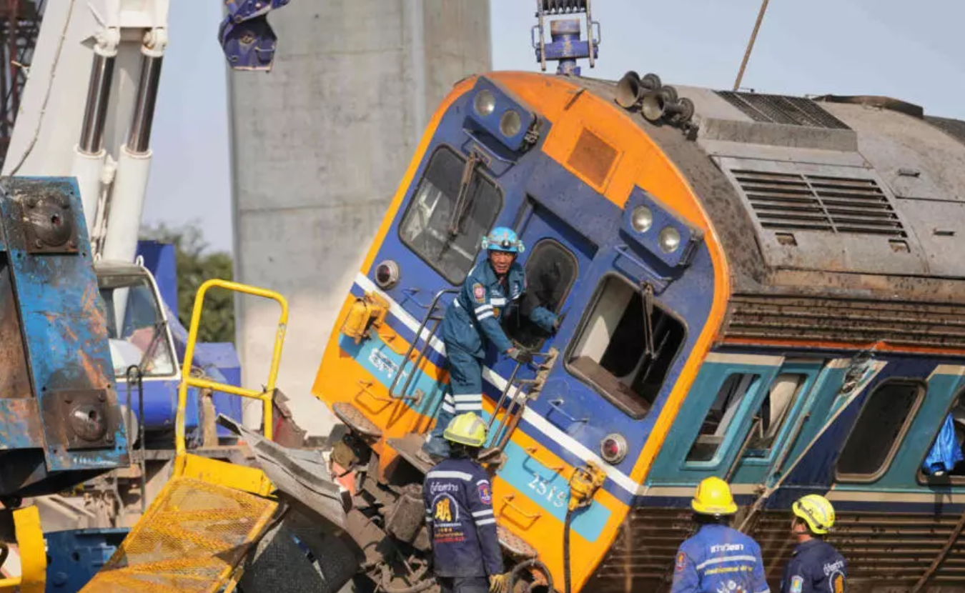 周三,泰国一辆客运列车被倒塌的起重机砸中,据当地当局称,这场惊心动魄的事故造成至少32人死亡,60多人受伤,其中7人伤势严重,另有3人仍下落不明。