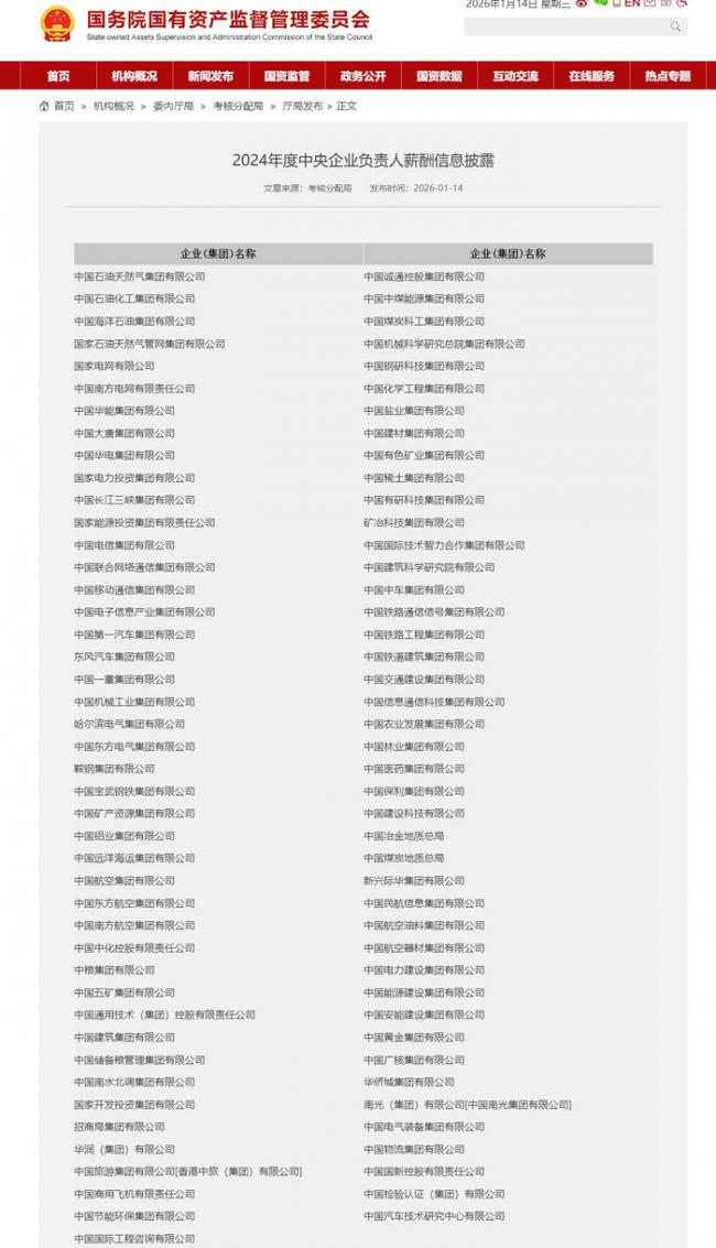 1月14日,中国国务院国资委网站通过提供各中央企业薪酬信息披露网页链接的方式,披露了所监管的80多家央企负责人2024年度薪酬信息。相关数据迅速在网络上传播,并登上多个平台热搜榜单。这份名单涵盖能源、金融、通信、交通等关键行业,被视为近年来较为完整的一次央企高管薪酬集中公开。