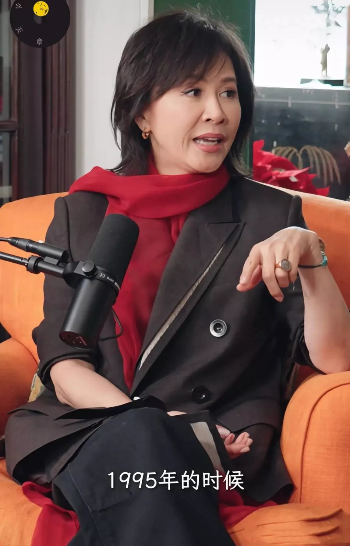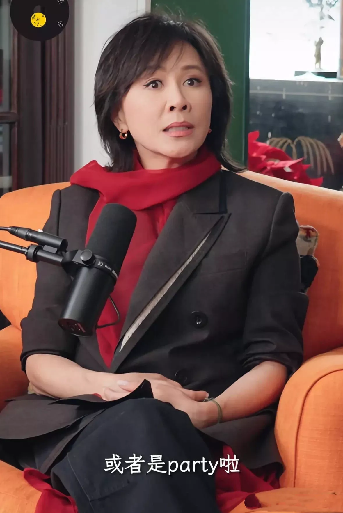 刘嘉玲穿一件黑色西服外套,脖子里披了红色围巾,整个人很美、很飒、很有精气神。
