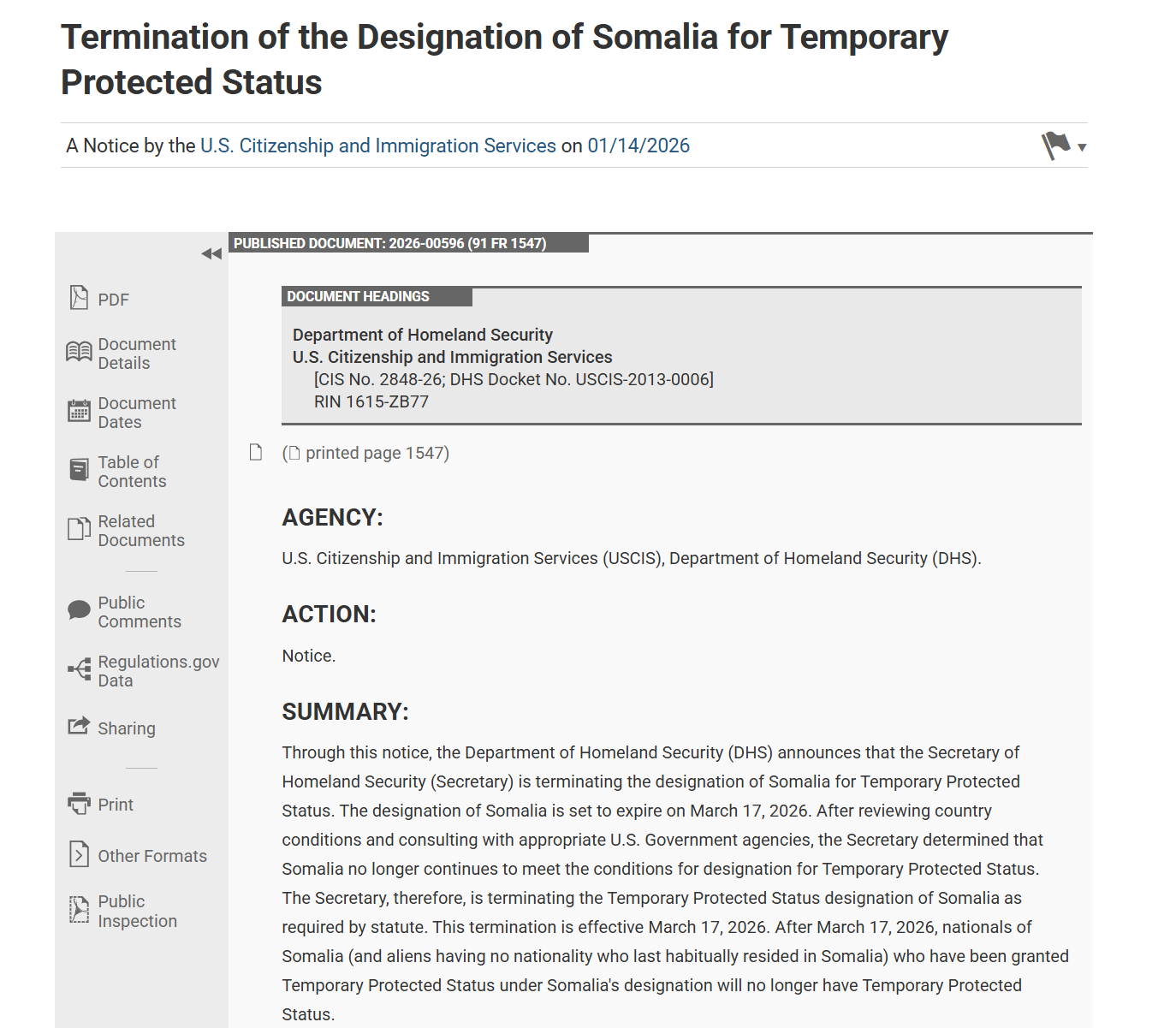 美国移民局(USCIS)表示,拥有TPS身份的索马里移民必须在3月17日之前离开美国。