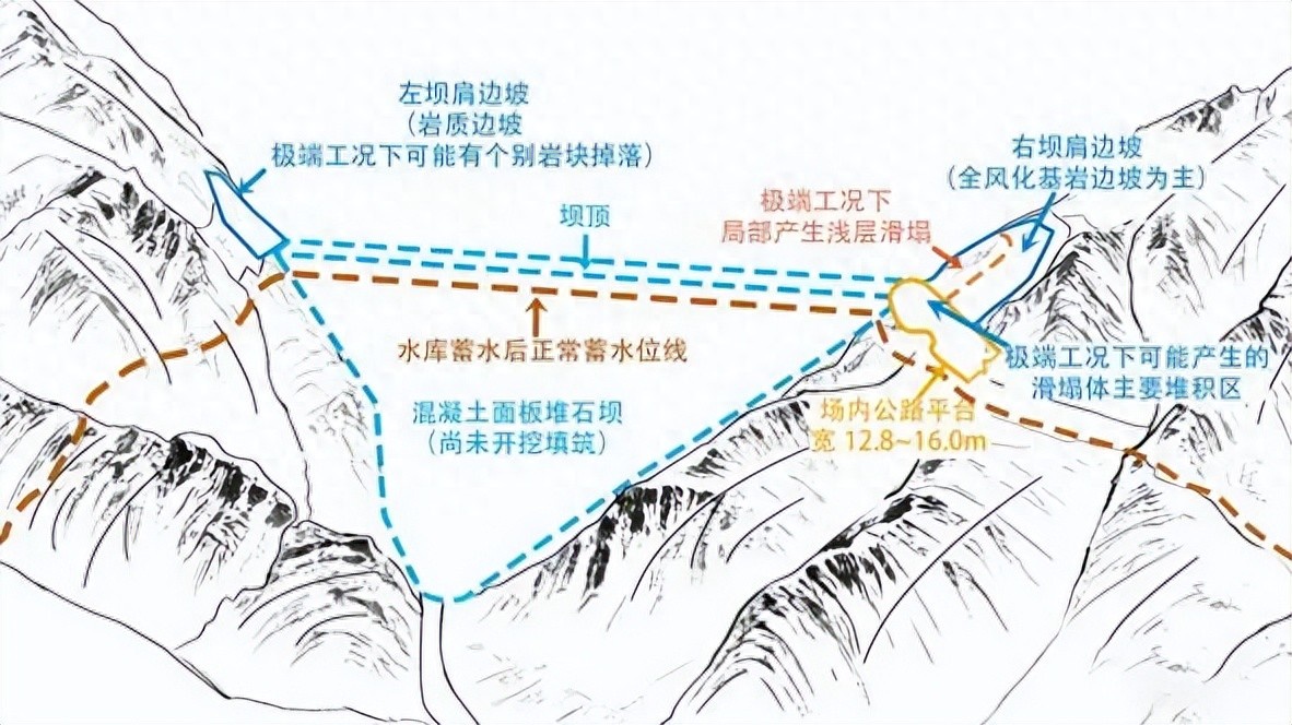 本工程下水库大坝采用混凝土面板堆石坝,尚未开始大坝主体施工。下水库坝肩边坡存在的部分锚筋桩、锚杆钢筋长度不足、焊接不规范、注浆量不足等问题将影响支护效果,可能导致边坡失稳。其中,左岸坝肩为岩质边坡,完整性较好,极端工况下可能有个别岩块掉落;右岸坝肩以全风化基岩边坡为主,稳定性相对较差,极端工况下可能发生约1000立方米的塌方,大部分塌方体将堆积在坝肩公路上(边坡与大坝间为场内公路,宽12.8米至16米,对应边坡垮塌位置可承接约2000立方米堆积体),导致场内交通道路受阻等,少量岩土体掉落坝顶或进入下水库,不会发生危害性涌浪,不会影响大坝(示意图附后)。中国电建正在组织施工单位制定整改方案,对存在的问题进行彻底整改,确保边坡稳定。