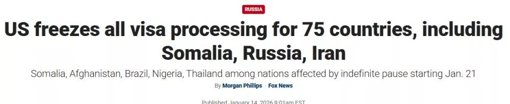 FOX报道截图:美国暂停对包括索马里、俄罗斯、伊朗在内的75个国家的签证办理。受此无限期暂停影响的国家包括索马里、阿富汗、巴西、尼日利亚、泰国等,暂停期自1月21日起生效。 美国国务院暂停75国移民签证受理 以强化“公共负担”审查